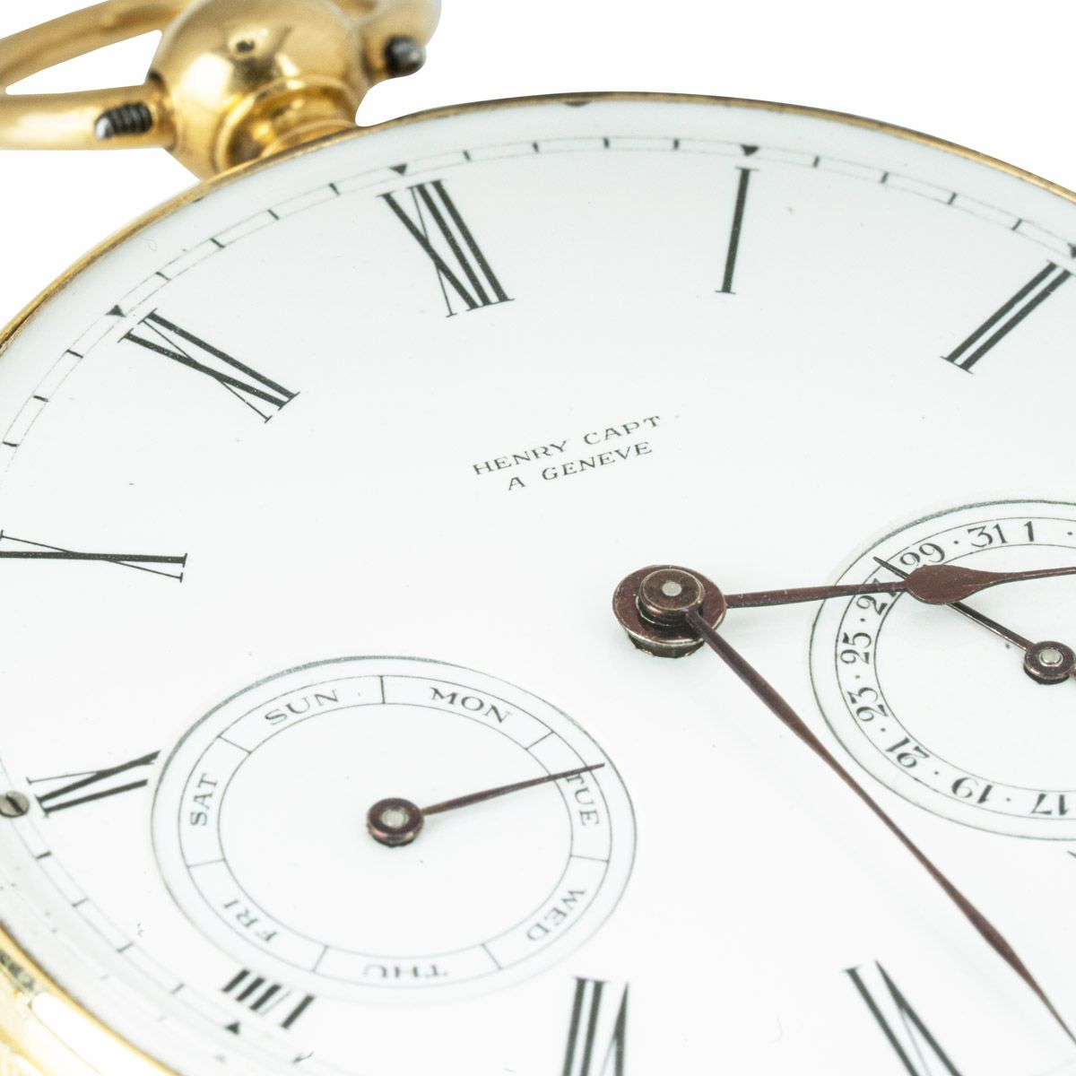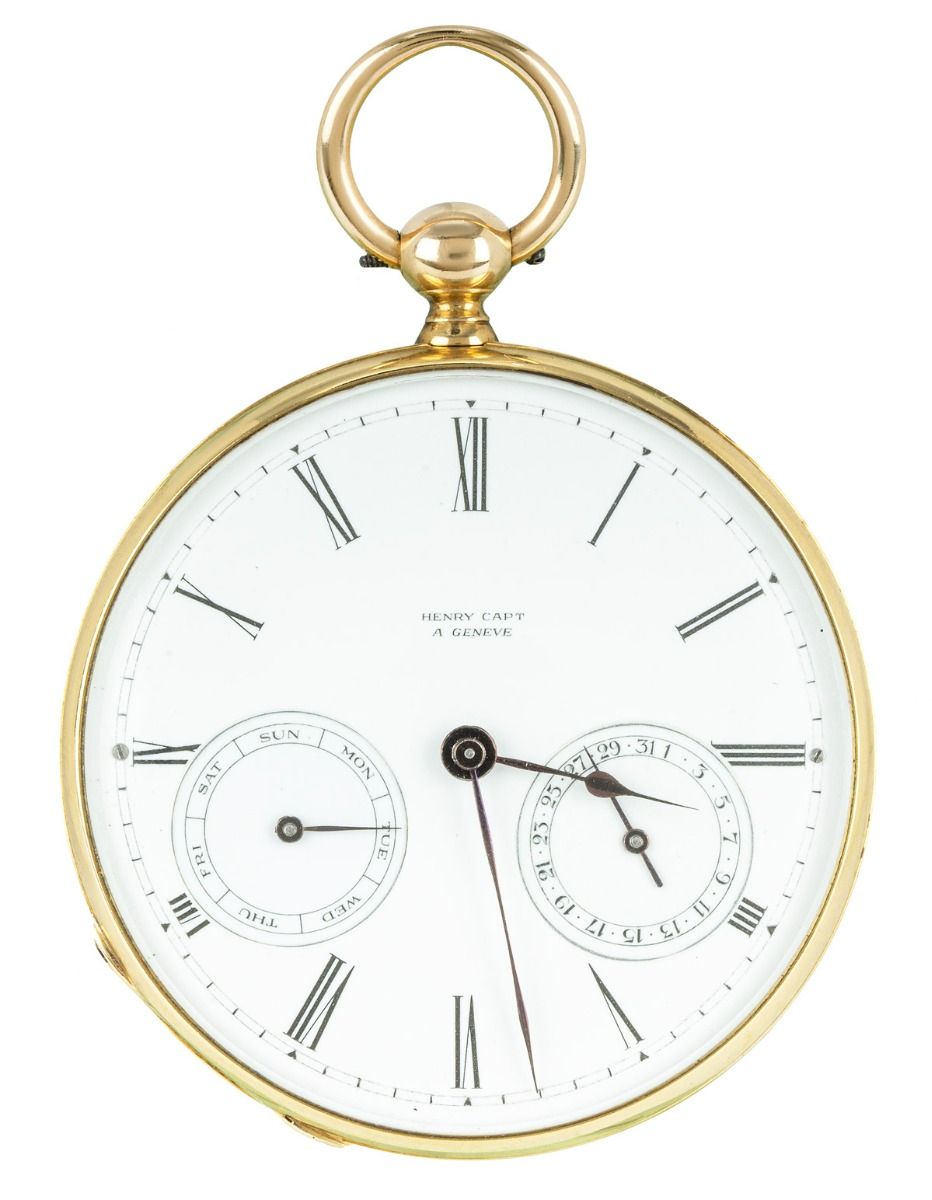 Dial: White enamel, Roman numerals, subsidiary dials for day & date, blued steel spade hands, signed "Henry Capt A Geneve"