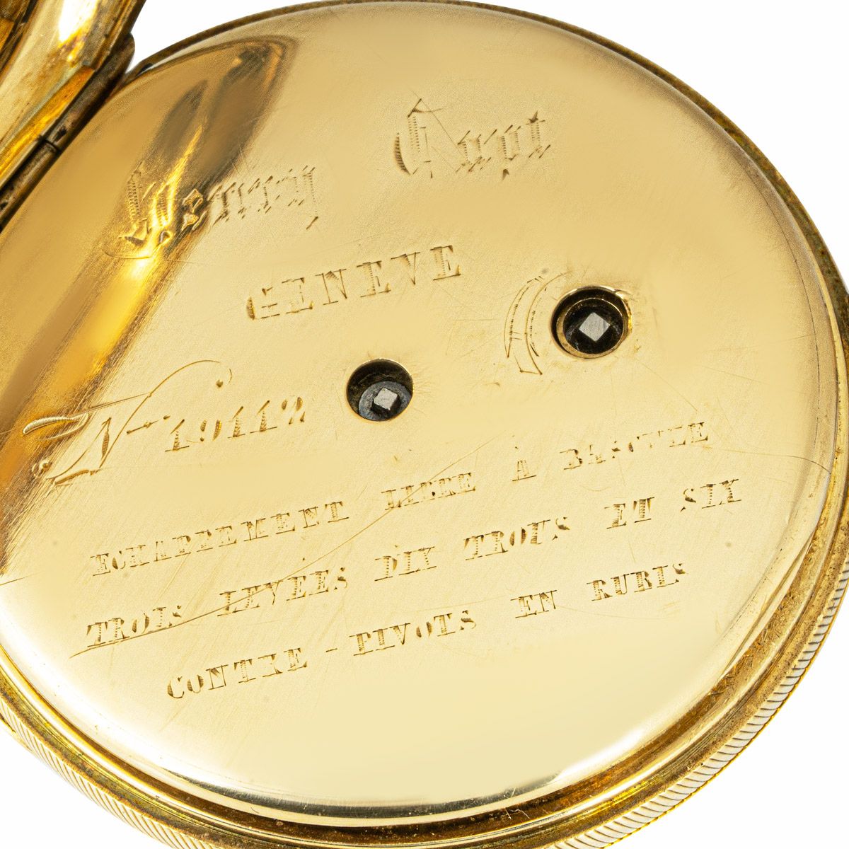 Case: Gold, cuvette signed "Henry Capt, Geneve, No 19119, Echappement libre a bascule trois levees dix trous et six contre-pivots en rubis", 48mm