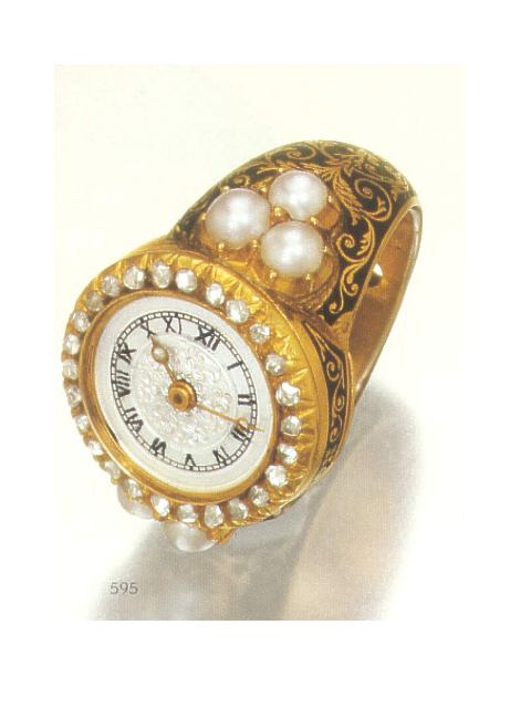 2002 - Antiquorum, 13 Apr 2002, est CHF25-30,000, sold CHF41,400, "Henry Capt, Genève, No. 8933, circa 1825. Very rare and fine 18K pearl- and diamond-set gold and enamel ring watch with original gold and enamel key, both in original leather fitted box. C. Entirely covered with black champlevé enamel with gold foliate decoration, shank extending at the top is set with three natural pearls on each side, diamond-set bezel, hinged gold cover at the bottom of the head revealing the winding, setting and regulating apertures. Key with tear-drop gold handle covered with alternating black enamel and gold stripes. D. Silver, radial Roman numerals, outer minute ring, center engraved with floral pattern. Gold Breguet hands. M. 14.35 mm. (6 1/3???), gilt brass, 10 jewels cylinder escapement three-arm gilt balance flat balance spring. Signed on the case. Dim. Width 23 mm. (between pearls), height 20 mm." |