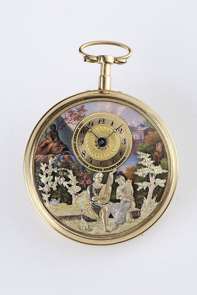 2013 - Dr Crott auction, 11 May 2013, est Eur100-150,000, "An important Geneva quarter repeating gold-enamel pocket watch with musical movement and 3 automatons Case: 18k gold, polished, reeded band, pusher for repetition via pendant, case maker's punch mark "ID". Dial: enamel, automatons "á quatre couleurs", depiction of a young man playing a lute and a lady playing a harp, on the left side two courting pigeons; polychrome enamelled background depicting an alpine landscape with a lake and houses, on the left a putto sitting on a fountain; peripheral gold engine-turned dial with Arabic numerals, blued Breguet hands. Movm.: full plate movement, firegilt, florally engraved, 2 hammers / 2 gongs, cylinder escapement, three-arm brass balance, pierced balance bridge, chatoned diamond endstone on balance, musical movement with tuned vibrating blades. Henry Capt (1773 - 1841) Capt was anindependent watchmaker who specialised in watches with additional functions such as musical watches and automatons; Capt was one of the first in Geneva to use barrels and crowns in his automatons. Born in Chenit in the Vallée de Joux in April 1773, he was the son of Jaques Samuel Capt and Susanne Piguet. On January 1, 1796, he married Henriette Piguet. Around 1789 Capt settled in Geneva and worked for several renowned companies such as Jaquet-Droz, Godet, Leschot and his brother-in-law Isaac Daniel Piguet. In 1802 he went into partnership with Daniel Isaac Piguet, which lasted until 1811. When this partnership ended, Capt kept producing his own pieces for some time before entering another partnership with Aubert et Fils in 1830. Capt's son Henry continued the business and won first prizes of the Geneva Observatory in 1878 and 1879; in 1882 he won the first prize for a palladium spring." |